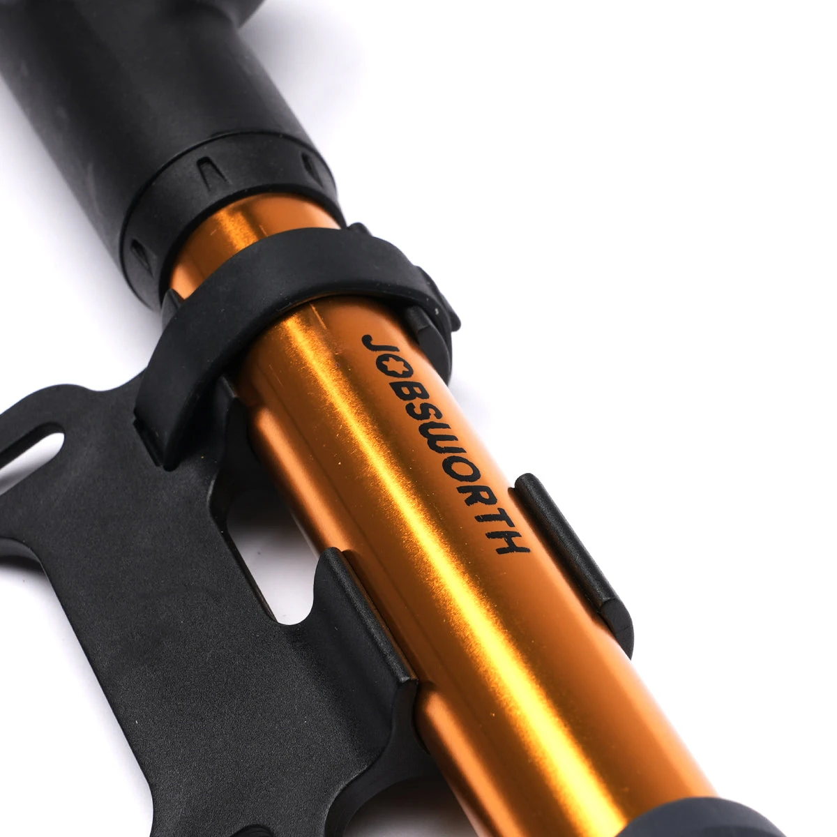 The Jobsworth High-pressure mini pump features an aluminium barrel, T handle and extractable dual-sided valve. With a precise 360-degree rotation pressure gauge the Jobsworth high-pressure pump can inflate up to 120psi.