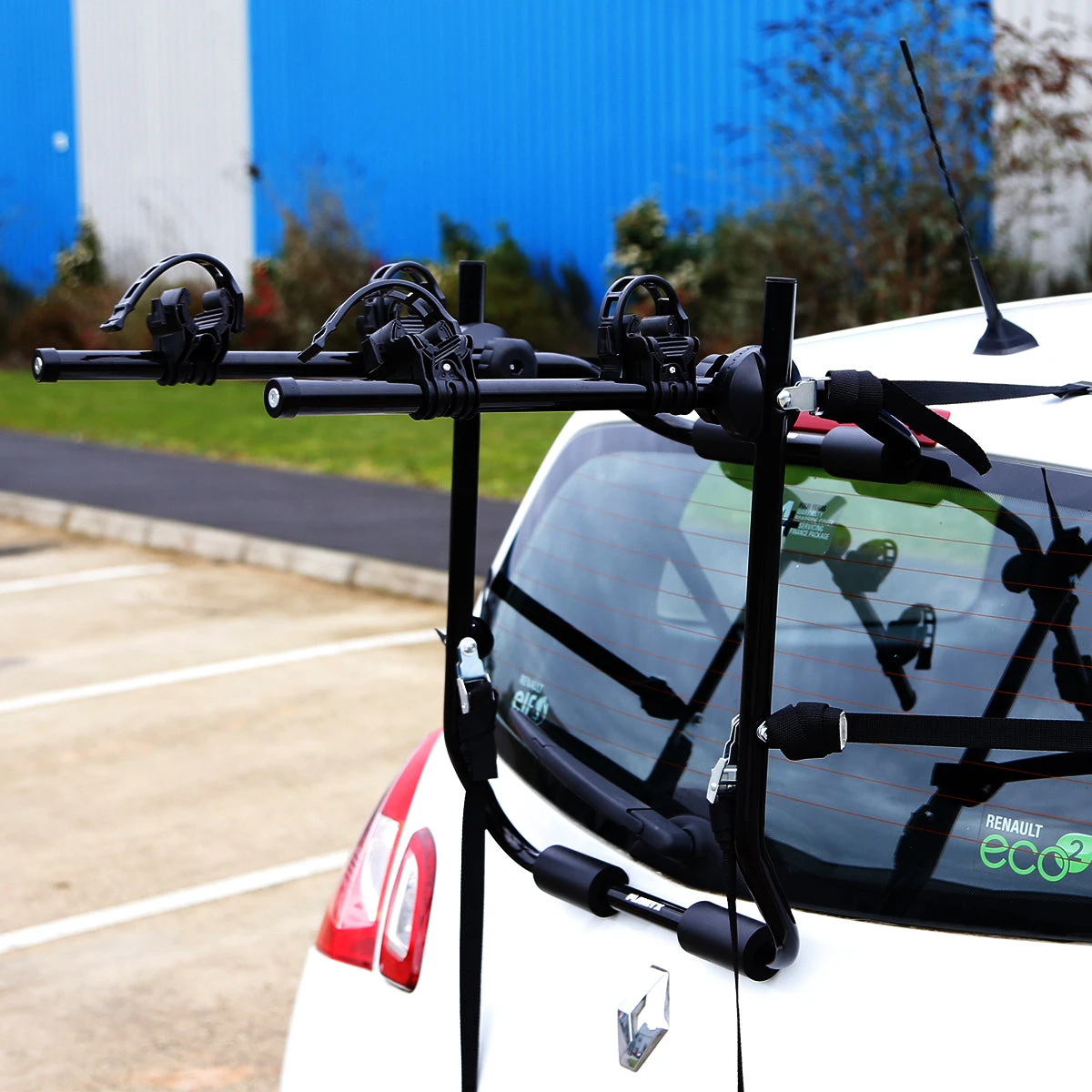 The Relay bike carrier holds 2 bikes and fits most cars.With 4 Secure point mounting strap system for a confident fit Adjustable carrier clips for storage Large load capacity up to 45kg